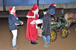 Wie in jedem Jahr startete die Feier um 15 Uhr mit einer Quadrille, an der in diesem Jahr 15 Reiterinnen teilnahmen. Anders als in den vielen, vielen Jahren vorher, wurde sie in diesem Jahr erstmalig nicht von Herrn Spennemann vorgestellt. Herr Spennemann hatte aus gesundheitlichen Gründen das Zepter an Frank Weißenberg abgegeben und von der Tribüne aus das Geschehen mit Argusaugen beobachtet. Aber Frank Weißenberg hat ihn würdig vertreten. Bei Glühwein und Kakao sahen die zahlreichen Zuschauer wie gewohnt eine schöne Quadrille. Im Anschluss kam der Weihnachtsmann mit seinem Schlitten und brachte für die Kleinen und die Großen Geschenke. Bei Kaffee und Kuchen haben wir dann gemütlich in der Vorhalle zusammen gesessen und das Jahr Revue passieren lassen.
